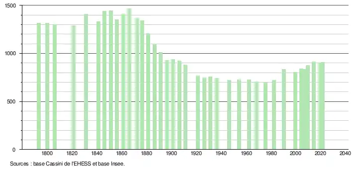 L'évolution du nombre d'habitants est connue à travers les recensements de la population effectués dans la commune depuis 1793. Pour les communes de moins de 10 000 habitants, une enquête de recensement portant sur toute la population est réalisée tous les cinq ans, les populations légales des années intermédiaires étant quant à elles estimées par interpolation ou extrapolation[36]. Pour la commune, le premier recensement exhaustif entrant dans le cadre du nouveau dispositif a été réalisé en 2004[37].
