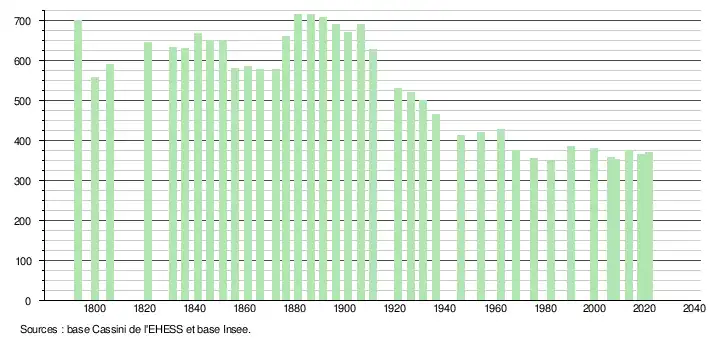 L'évolution du nombre d'habitants est connue à travers les recensements de la population effectués dans la commune depuis 1793. Pour les communes de moins de 10 000 habitants, une enquête de recensement portant sur toute la population est réalisée tous les cinq ans, les populations légales des années intermédiaires étant quant à elles estimées par interpolation ou extrapolation[17]. Pour la commune, le premier recensement exhaustif entrant dans le cadre du nouveau dispositif a été réalisé en 2008[18].