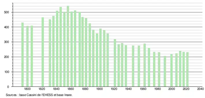 L'évolution du nombre d'habitants est connue à travers les recensements de la population effectués dans la commune depuis 1793. Pour les communes de moins de 10 000 habitants, une enquête de recensement portant sur toute la population est réalisée tous les cinq ans, les populations légales des années intermédiaires étant quant à elles estimées par interpolation ou extrapolation[17]. Pour la commune, le premier recensement exhaustif entrant dans le cadre du nouveau dispositif a été réalisé en 2006[18].
