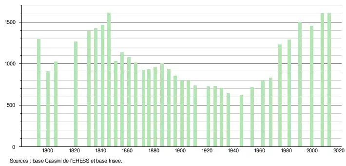 L'évolution du nombre d'habitants est connue à travers les recensements de la population effectués dans la commune depuis 1793. À partir du , les populations légales des communes sont publiées annuellement dans le cadre d'un recensement qui repose désormais sur une collecte d'information annuelle, concernant successivement tous les territoires communaux au cours d'une période de cinq ans. Pour les communes de moins de 10 000 habitants, une enquête de recensement portant sur toute la population est réalisée tous les cinq ans, les populations légales des années intermédiaires étant quant à elles estimées par interpolation ou extrapolation[13]. Pour la commune, le premier recensement exhaustif entrant dans le cadre du nouveau dispositif a été réalisé en 2007[14],[Note 2].