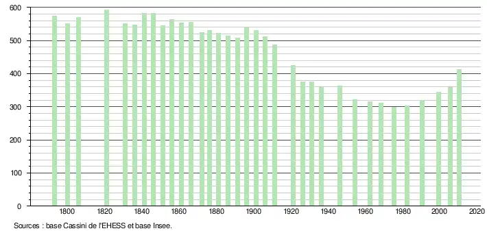 - Par convention dans Wikipédia, le principe a été retenu de n’afficher dans le tableau des recensements et le graphique, pour les populations légales postérieures à 1999, que les populations correspondant à une enquête exhaustive de recensement pour les communes de moins de 10 000 habitants, et que les populations des années 2006, 2011, 2016, etc. pour les communes de plus de 10 000 habitants, ainsi que la dernière population légale publiée par l’Insee pour l'ensemble des communes.