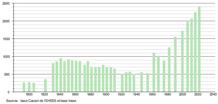 L'évolution du nombre d'habitants est connue à travers les recensements de la population effectués dans la commune depuis 1793. Pour les communes de moins de 10 000 habitants, une enquête de recensement portant sur toute la population est réalisée tous les cinq ans, les populations légales des années intermédiaires étant quant à elles estimées par interpolation ou extrapolation[20]. Pour la commune, le premier recensement exhaustif entrant dans le cadre du nouveau dispositif a été réalisé en 2006[21].