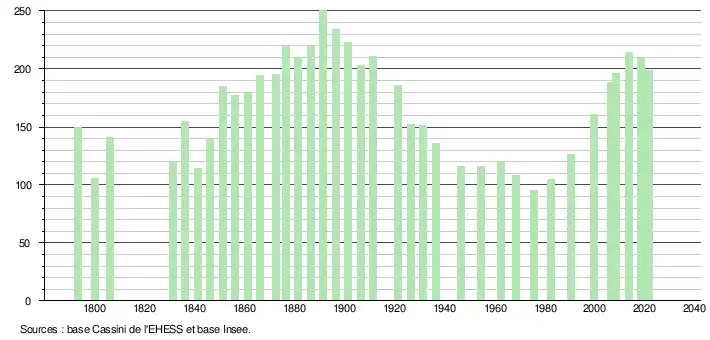 L'évolution du nombre d'habitants est connue à travers les recensements de la population effectués dans la commune depuis 1793. Pour les communes de moins de 10 000 habitants, une enquête de recensement portant sur toute la population est réalisée tous les cinq ans, les populations légales des années intermédiaires étant quant à elles estimées par interpolation ou extrapolation[20]. Pour la commune, le premier recensement exhaustif entrant dans le cadre du nouveau dispositif a été réalisé en 2008[21].