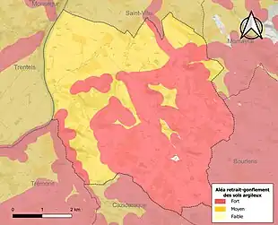 Le retrait-gonflement des sols argileux est susceptible d'engendrer des dommages importants aux bâtiments en cas d’alternance de périodes de sécheresse et de pluie[23]. 99,8 % de la superficie communale est en aléa moyen ou fort (91,8 % au niveau départemental et 48,5 % au niveau national)[Carte 2]. Depuis le , en application de la loi ELAN, différentes contraintes s'imposent aux vendeurs, maîtres d'ouvrages ou constructeurs de biens situés dans une zone classée en aléa moyen ou fort[Note 4],[24].