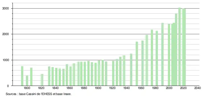 L'évolution du nombre d'habitants est connue à travers les recensements de la population effectués dans la commune depuis 1793. Pour les communes de moins de 10 000 habitants, une enquête de recensement portant sur toute la population est réalisée tous les cinq ans, les populations légales des années intermédiaires étant quant à elles estimées par interpolation ou extrapolation[23]. Pour la commune, le premier recensement exhaustif entrant dans le cadre du nouveau dispositif a été réalisé en 2004[24].