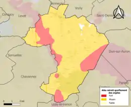 La commune est vulnérable au risque de mouvements de terrains constitué principalement du retrait-gonflement des sols argileux[15]. Cet aléa est susceptible d'engendrer des dommages importants aux bâtiments en cas d’alternance de périodes de sécheresse et de pluie. 99,2 % de la superficie communale est en aléa moyen ou fort (90 % au niveau départemental et 48,5 % au niveau national). Sur les 322 bâtiments dénombrés sur la commune en 2019, 322 sont en aléa moyen ou fort, soit 100 %, à comparer aux 83 % au niveau départemental et 54 % au niveau national. Une cartographie de l'exposition du territoire national au retrait gonflement des sols argileux est disponible sur le site du BRGM[16],[Carte 2].