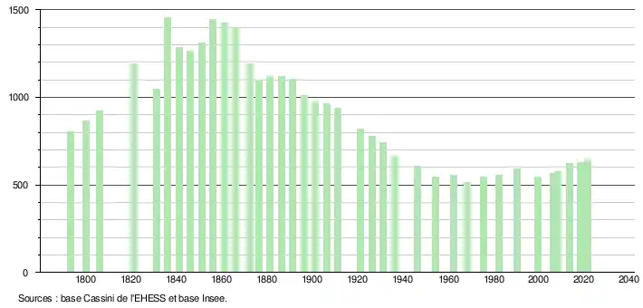 L'évolution du nombre d'habitants est connue à travers les recensements de la population effectués dans la commune depuis 1793. Pour les communes de moins de 10 000 habitants, une enquête de recensement portant sur toute la population est réalisée tous les cinq ans, les populations légales des années intermédiaires étant quant à elles estimées par interpolation ou extrapolation[21]. Pour la commune, le premier recensement exhaustif entrant dans le cadre du nouveau dispositif a été réalisé en 2008[22].