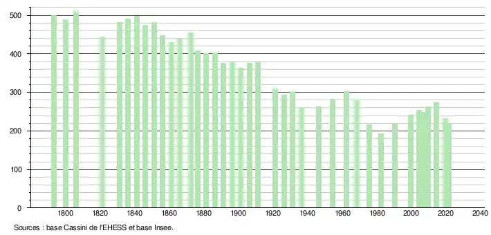 L'évolution du nombre d'habitants est connue à travers les recensements de la population effectués dans la commune depuis 1793. Pour les communes de moins de 10 000 habitants, une enquête de recensement portant sur toute la population est réalisée tous les cinq ans, les populations légales des années intermédiaires étant quant à elles estimées par interpolation ou extrapolation[24]. Pour la commune, le premier recensement exhaustif entrant dans le cadre du nouveau dispositif a été réalisé en 2004[25].