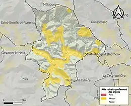 Le retrait-gonflement des sols argileux est susceptible d'engendrer des dommages importants aux bâtiments en cas d’alternance de périodes de sécheresse et de pluie. 32 % de la superficie communale est en aléa moyen ou fort (59,3 % au niveau départemental et 48,5 % au niveau national). Sur les 567 bâtiments dénombrés sur la commune en 2019, 486 sont en aléa moyen ou fort, soit 86 %, à comparer aux 85 % au niveau départemental et 54 % au niveau national. Une cartographie de l'exposition du territoire national au retrait gonflement des sols argileux est disponible sur le site du BRGM[28],[Carte 2].