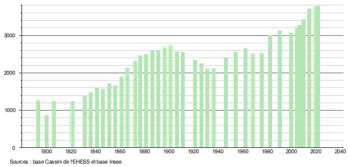 L'évolution du nombre d'habitants est connue à travers les recensements de la population effectués dans la commune depuis 1793. Pour les communes de moins de 10 000 habitants, une enquête de recensement portant sur toute la population est réalisée tous les cinq ans, les populations légales des années intermédiaires étant quant à elles estimées par interpolation ou extrapolation[24]. Pour la commune, le premier recensement exhaustif entrant dans le cadre du nouveau dispositif a été réalisé en 2004[25].