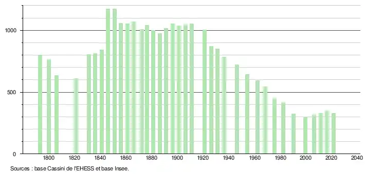 L'évolution du nombre d'habitants est connue à travers les recensements de la population effectués dans la commune depuis 1793. Pour les communes de moins de 10 000 habitants, une enquête de recensement portant sur toute la population est réalisée tous les cinq ans, les populations légales des années intermédiaires étant quant à elles estimées par interpolation ou extrapolation[31]. Pour la commune, le premier recensement exhaustif entrant dans le cadre du nouveau dispositif a été réalisé en 2006[32].
