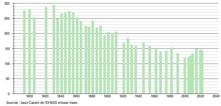L'évolution du nombre d'habitants est connue à travers les recensements de la population effectués dans la commune depuis 1793. Pour les communes de moins de 10 000 habitants, une enquête de recensement portant sur toute la population est réalisée tous les cinq ans, les populations légales des années intermédiaires étant quant à elles estimées par interpolation ou extrapolation[16]. Pour la commune, le premier recensement exhaustif entrant dans le cadre du nouveau dispositif a été réalisé en 2004[17].