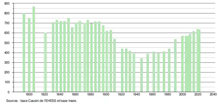 L'évolution du nombre d'habitants est connue à travers les recensements de la population effectués dans la commune depuis 1793. Pour les communes de moins de 10 000 habitants, une enquête de recensement portant sur toute la population est réalisée tous les cinq ans, les populations légales des années intermédiaires étant quant à elles estimées par interpolation ou extrapolation[17]. Pour la commune, le premier recensement exhaustif entrant dans le cadre du nouveau dispositif a été réalisé en 2004[18].