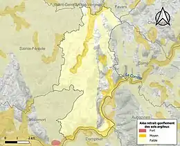 Le retrait-gonflement des sols argileux est susceptible d'engendrer des dommages importants aux bâtiments en cas d’alternance de périodes de sécheresse et de pluie. 17,5 % de la superficie communale est en aléa moyen ou fort (26,8 % au niveau départemental et 48,5 % au niveau national). Sur les 466 bâtiments dénombrés sur la commune en 2019, 36 sont en aléa moyen ou fort, soit 8 %, à comparer aux 36 % au niveau départemental et 54 % au niveau national. Une cartographie de l'exposition du territoire national au retrait gonflement des sols argileux est disponible sur le site du BRGM[20],[Carte 2].