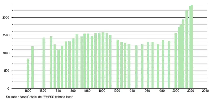L'évolution du nombre d'habitants est connue à travers les recensements de la population effectués dans la commune depuis 1800. Pour les communes de moins de 10 000 habitants, une enquête de recensement portant sur toute la population est réalisée tous les cinq ans, les populations légales des années intermédiaires étant quant à elles estimées par interpolation ou extrapolation[28]. Pour la commune, le premier recensement exhaustif entrant dans le cadre du nouveau dispositif a été réalisé en 2004[29].