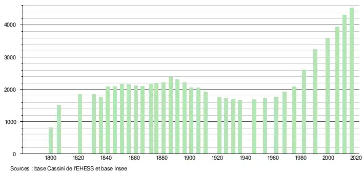 L'évolution du nombre d'habitants est connue à travers les recensements de la population effectués dans la commune depuis 1800. Pour les communes de moins de 10 000 habitants, une enquête de recensement portant sur toute la population est réalisée tous les cinq ans, les populations légales des années intermédiaires étant quant à elles estimées par interpolation ou extrapolation[26]. Pour la commune, le premier recensement exhaustif entrant dans le cadre du nouveau dispositif a été réalisé en 2006[27].