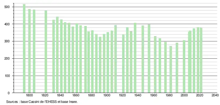 L'évolution du nombre d'habitants est connue à travers les recensements de la population effectués dans la commune depuis 1793. Pour les communes de moins de 10 000 habitants, une enquête de recensement portant sur toute la population est réalisée tous les cinq ans, les populations légales des années intermédiaires étant quant à elles estimées par interpolation ou extrapolation[21]. Pour la commune, le premier recensement exhaustif entrant dans le cadre du nouveau dispositif a été réalisé en 2007[22].