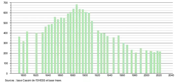 L'évolution du nombre d'habitants est connue à travers les recensements de la population effectués dans la commune depuis 1793. Pour les communes de moins de 10 000 habitants, une enquête de recensement portant sur toute la population est réalisée tous les cinq ans, les populations légales des années intermédiaires étant quant à elles estimées par interpolation ou extrapolation[15]. Pour la commune, le premier recensement exhaustif entrant dans le cadre du nouveau dispositif a été réalisé en 2007[16].