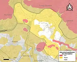 Le retrait-gonflement des sols argileux est susceptible d'engendrer des dommages importants aux bâtiments en cas d’alternance de périodes de sécheresse et de pluie. 78,9 % de la superficie communale est en aléa moyen ou fort (54,2 % au niveau départemental et 48,5 % au niveau national). Sur les 637 bâtiments dénombrés sur la commune en 2019, 206 sont en aléa moyen ou fort, soit 32 %, à comparer aux 57 % au niveau départemental et 54 % au niveau national. Une cartographie de l'exposition du territoire national au retrait gonflement des sols argileux est disponible sur le site du BRGM[19],[Carte 2].