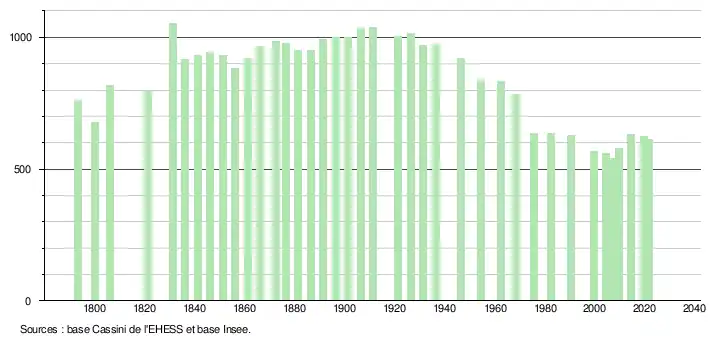 L'évolution du nombre d'habitants est connue à travers les recensements de la population effectués dans la commune depuis 1793. Pour les communes de moins de 10 000 habitants, une enquête de recensement portant sur toute la population est réalisée tous les cinq ans, les populations légales des années intermédiaires étant quant à elles estimées par interpolation ou extrapolation[34]. Pour la commune, le premier recensement exhaustif entrant dans le cadre du nouveau dispositif a été réalisé en 2004[35].