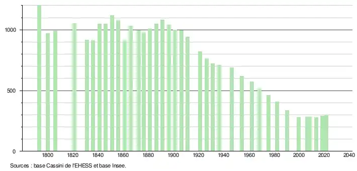 L'évolution du nombre d'habitants est connue à travers les recensements de la population effectués dans la commune depuis 1793. Pour les communes de moins de 10 000 habitants, une enquête de recensement portant sur toute la population est réalisée tous les cinq ans, les populations légales des années intermédiaires étant quant à elles estimées par interpolation ou extrapolation[20]. Pour la commune, le premier recensement exhaustif entrant dans le cadre du nouveau dispositif a été réalisé en 2008[21].