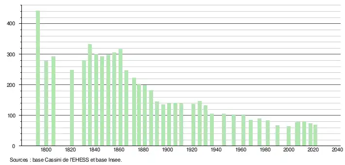 L'évolution du nombre d'habitants est connue à travers les recensements de la population effectués dans la commune depuis 1793. Pour les communes de moins de 10 000 habitants, une enquête de recensement portant sur toute la population est réalisée tous les cinq ans, les populations légales des années intermédiaires étant quant à elles estimées par interpolation ou extrapolation[41]. Pour la commune, le premier recensement exhaustif entrant dans le cadre du nouveau dispositif a été réalisé en 2007[42].