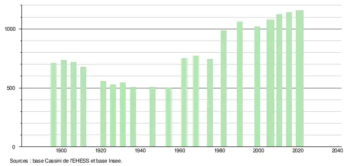 L'évolution du nombre d'habitants est connue à travers les recensements de la population effectués dans la commune depuis 1896. Pour les communes de moins de 10 000 habitants, une enquête de recensement portant sur toute la population est réalisée tous les cinq ans, les populations légales des années intermédiaires étant quant à elles estimées par interpolation ou extrapolation[40]. Pour la commune, le premier recensement exhaustif entrant dans le cadre du nouveau dispositif a été réalisé en 2005[41].