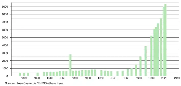 L'évolution du nombre d'habitants est connue à travers les recensements de la population effectués dans la commune depuis 1793. Pour les communes de moins de 10 000 habitants, une enquête de recensement portant sur toute la population est réalisée tous les cinq ans, les populations légales des années intermédiaires étant quant à elles estimées par interpolation ou extrapolation[42]. Pour la commune, le premier recensement exhaustif entrant dans le cadre du nouveau dispositif a été réalisé en 2004[43].