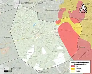 Le retrait-gonflement des sols argileux est susceptible d'engendrer des dommages importants aux bâtiments en cas d’alternance de périodes de sécheresse et de pluie. 20,8 % de la superficie communale est en aléa moyen ou fort (67,4 % au niveau départemental et 48,5 % au niveau national). Sur les 2 765 bâtiments dénombrés sur la commune en 2019, 1 116 sont en aléa moyen ou fort, soit 40 %, à comparer aux 84 % au niveau départemental et 54 % au niveau national. Une cartographie de l'exposition du territoire national au retrait gonflement des sols argileux est disponible sur le site du BRGM[27],[Carte 2].