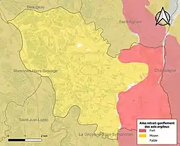 Le retrait-gonflement des sols argileux est susceptible d'engendrer des dommages importants aux bâtiments en cas d’alternance de périodes de sécheresse et de pluie. 99,1 % de la superficie communale est en aléa moyen ou fort (54,2 % au niveau départemental et 48,5 % au niveau national). Sur les 299 bâtiments dénombrés sur la commune en 2019, 299 sont en aléa moyen ou fort, soit 100 %, à comparer aux 57 % au niveau départemental et 54 % au niveau national. Une cartographie de l'exposition du territoire national au retrait gonflement des sols argileux est disponible sur le site du BRGM[12],[Carte 2].
