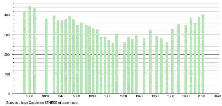 L'évolution du nombre d'habitants est connue à travers les recensements de la population effectués dans la commune depuis 1793. Pour les communes de moins de 10 000 habitants, une enquête de recensement portant sur toute la population est réalisée tous les cinq ans, les populations légales des années intermédiaires étant quant à elles estimées par interpolation ou extrapolation[22]. Pour la commune, le premier recensement exhaustif entrant dans le cadre du nouveau dispositif a été réalisé en 2006[23].