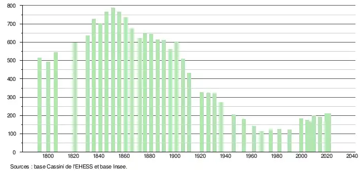 | L'évolution du nombre d'habitants est connue à travers les recensements de la population effectués dans la commune depuis 1793. Pour les communes de moins de 10 000 habitants, une enquête de recensement portant sur toute la population est réalisée tous les cinq ans, les populations légales des années intermédiaires étant quant à elles estimées par interpolation ou extrapolation[35]. Pour la commune, le premier recensement exhaustif entrant dans le cadre du nouveau dispositif a été réalisé en 2004[36]. En 2021, la commune comptait 211 habitants[Note 7], en augmentation de 11,05 % par rapport à 2015 (Hérault : +7,29 %, France hors Mayotte : +1,84 %). |