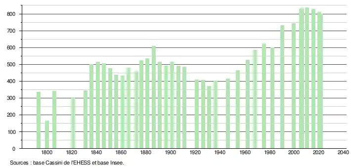 L'évolution du nombre d'habitants est connue à travers les recensements de la population effectués dans la commune depuis 1793. Pour les communes de moins de 10 000 habitants, une enquête de recensement portant sur toute la population est réalisée tous les cinq ans, les populations légales des années intermédiaires étant quant à elles estimées par interpolation ou extrapolation[19]. Pour la commune, le premier recensement exhaustif entrant dans le cadre du nouveau dispositif a été réalisé en 2005[20].