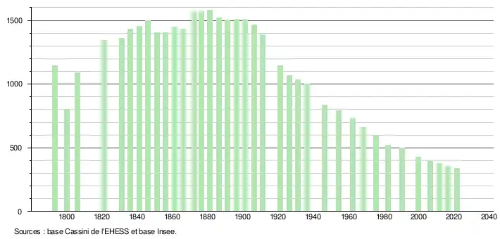 L'évolution du nombre d'habitants est connue à travers les recensements de la population effectués dans la commune depuis 1793. Pour les communes de moins de 10 000 habitants, une enquête de recensement portant sur toute la population est réalisée tous les cinq ans, les populations légales des années intermédiaires étant quant à elles estimées par interpolation ou extrapolation[18]. Pour la commune, le premier recensement exhaustif entrant dans le cadre du nouveau dispositif a été réalisé en 2006[19].