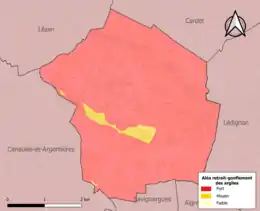 Le retrait-gonflement des sols argileux est susceptible d'engendrer des dommages importants aux bâtiments en cas d’alternance de périodes de sécheresse et de pluie. La totalité de la commune est en aléa moyen ou fort (67,5 % au niveau départemental et 48,5 % au niveau national). Sur les 230 bâtiments dénombrés sur la commune en 2019, 230 sont en aléa moyen ou fort, soit 100 %, à comparer aux 90 % au niveau départemental et 54 % au niveau national. Une cartographie de l'exposition du territoire national au retrait gonflement des sols argileux est disponible sur le site du BRGM[16],[Carte 2].