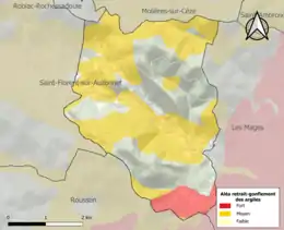 La commune est vulnérable au risque de mouvements de terrains constitué principalement du retrait-gonflement des sols argileux[22]. Cet aléa est susceptible d'engendrer des dommages importants aux bâtiments en cas d’alternance de périodes de sécheresse et de pluie. 58,5 % de la superficie communale est en aléa moyen ou fort (67,5 % au niveau départemental et 48,5 % au niveau national). Sur les 253 bâtiments dénombrés sur la commune en 2019, 192 sont en aléa moyen ou fort, soit 76 %, à comparer aux 90 % au niveau départemental et 54 % au niveau national. Une cartographie de l'exposition du territoire national au retrait gonflement des sols argileux est disponible sur le site du BRGM[23],[Carte 2].