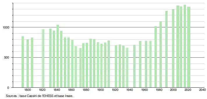 L'évolution du nombre d'habitants est connue à travers les recensements de la population effectués dans la commune depuis 1793. Pour les communes de moins de 10 000 habitants, une enquête de recensement portant sur toute la population est réalisée tous les cinq ans, les populations légales des années intermédiaires étant quant à elles estimées par interpolation ou extrapolation[24]. Pour la commune, le premier recensement exhaustif entrant dans le cadre du nouveau dispositif a été réalisé en 2005[25].