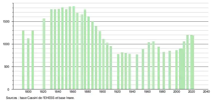 L'évolution du nombre d'habitants est connue à travers les recensements de la population effectués dans la commune depuis 1793. Pour les communes de moins de 10 000 habitants, une enquête de recensement portant sur toute la population est réalisée tous les cinq ans, les populations légales des années intermédiaires étant quant à elles estimées par interpolation ou extrapolation[14]. Pour la commune, le premier recensement exhaustif entrant dans le cadre du nouveau dispositif a été réalisé en 2004[15].