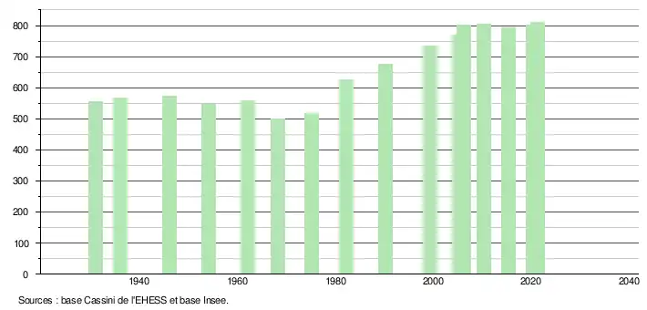 L'évolution du nombre d'habitants est connue à travers les recensements de la population effectués dans la commune depuis 1931. Pour les communes de moins de 10 000 habitants, une enquête de recensement portant sur toute la population est réalisée tous les cinq ans, les populations légales des années intermédiaires étant quant à elles estimées par interpolation ou extrapolation[18]. Pour la commune, le premier recensement exhaustif entrant dans le cadre du nouveau dispositif a été réalisé en 2005[19].