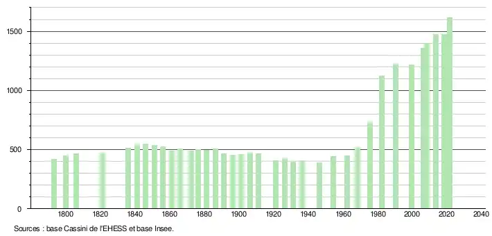 L'évolution du nombre d'habitants est connue à travers les recensements de la population effectués dans la commune depuis 1793. Pour les communes de moins de 10 000 habitants, une enquête de recensement portant sur toute la population est réalisée tous les cinq ans, les populations légales des années intermédiaires étant quant à elles estimées par interpolation ou extrapolation[17]. Pour la commune, le premier recensement exhaustif entrant dans le cadre du nouveau dispositif a été réalisé en 2008[18].