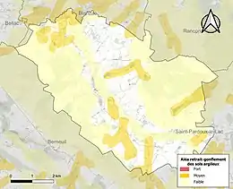 Le retrait-gonflement des sols argileux est susceptible d'engendrer des dommages importants aux bâtiments en cas d’alternance de périodes de sécheresse et de pluie[17]. 15,9 % de la superficie communale est en aléa moyen ou fort (27 % au niveau départemental et 48,5 % au niveau national métropolitain)[Carte 2]. Depuis le , en application de la loi ÉLAN, différentes contraintes s'imposent aux vendeurs, maîtres d'ouvrages ou constructeurs de biens situés dans une zone classée en aléa moyen ou fort[Note 3],[18].