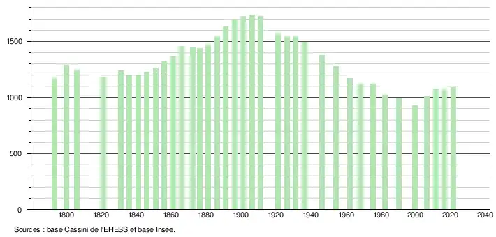 L'évolution du nombre d'habitants est connue à travers les recensements de la population effectués dans la commune depuis 1793. Pour les communes de moins de 10 000 habitants, une enquête de recensement portant sur toute la population est réalisée tous les cinq ans, les populations légales des années intermédiaires étant quant à elles estimées par interpolation ou extrapolation[19]. Pour la commune, le premier recensement exhaustif entrant dans le cadre du nouveau dispositif a été réalisé en 2006[20].