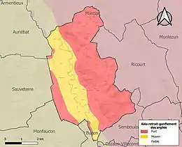 Le retrait-gonflement des sols argileux est susceptible d'engendrer des dommages importants aux bâtiments en cas d’alternance de périodes de sécheresse et de pluie. La totalité de la commune est en aléa moyen ou fort (94,5 % au niveau départemental et 48,5 % au niveau national). Sur les 99 bâtiments dénombrés sur la commune en 2019, 99 sont en aléa moyen ou fort, soit 100 %, à comparer aux 93 % au niveau départemental et 54 % au niveau national. Une cartographie de l'exposition du territoire national au retrait gonflement des sols argileux est disponible sur le site du BRGM[21],[Carte 3].