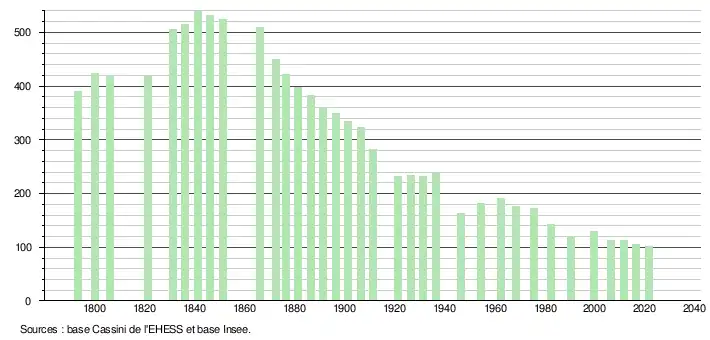 L'évolution du nombre d'habitants est connue à travers les recensements de la population effectués dans la commune depuis 1793. Pour les communes de moins de 10 000 habitants, une enquête de recensement portant sur toute la population est réalisée tous les cinq ans, les populations légales des années intermédiaires étant quant à elles estimées par interpolation ou extrapolation[18]. Pour la commune, le premier recensement exhaustif entrant dans le cadre du nouveau dispositif a été réalisé en 2006[19].