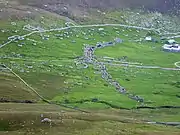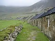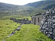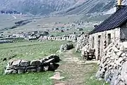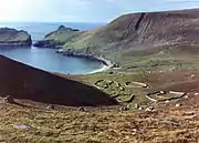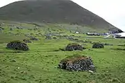 L'archipel a été continuellement habité depuis au moins deux millénaires, de l'Âge du bronze au XXe siècle[36]. Dernièrement, une preuve directe d'un peuplement plus ancien remontant au Néolithique fut apportée par des tessons de poterie trouvés à l'est du village ; ces vestiges sont du même style que les céramiques des Hébrides. La découverte consécutive d'une carrière de pierre sur Mullach Sgar, au-dessus de Village Bay, entraîna la mise au jour de nombreux outils lithiques : socs de houe, pierres à aiguiser[note 7] et couteaux de Skaill[note 8]. Ces outils furent trouvés dans un cleitean, bâtiment en pierre (voir ci-contre) servant à entreposer des objets.