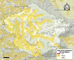 Le retrait-gonflement des sols argileux est susceptible d'engendrer des dommages importants aux bâtiments en cas d’alternance de périodes de sécheresse et de pluie[17]. 38 % de la superficie communale est en aléa moyen ou fort (27 % au niveau départemental et 48,5 % au niveau national métropolitain)[Carte 2]. Depuis le , en application de la loi ÉLAN, différentes contraintes s'imposent aux vendeurs, maîtres d'ouvrages ou constructeurs de biens situés dans une zone classée en aléa moyen ou fort[Note 7],[18].