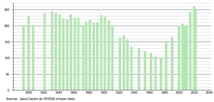 L'évolution du nombre d'habitants est connue à travers les recensements de la population effectués dans la commune depuis 1793. Pour les communes de moins de 10 000 habitants, une enquête de recensement portant sur toute la population est réalisée tous les cinq ans, les populations légales des années intermédiaires étant quant à elles estimées par interpolation ou extrapolation[42]. Pour la commune, le premier recensement exhaustif entrant dans le cadre du nouveau dispositif a été réalisé en 2004[43].