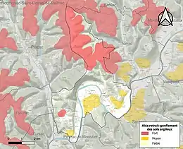 Les mouvements de terrains susceptibles de se produire sur la commune sont des tassements différentiels[40]. Le retrait-gonflement des sols argileux est susceptible d'engendrer des dommages importants aux bâtiments en cas d’alternance de périodes de sécheresse et de pluie[41]. 33,9 % de la superficie communale est en aléa moyen ou fort (58,6 % au niveau départemental et 48,5 % au niveau national métropolitain)[Carte 4]. Depuis le , en application de la loi ÉLAN, différentes contraintes s'imposent aux vendeurs, maîtres d'ouvrages ou constructeurs de biens situés dans une zone classée en aléa moyen ou fort[Note 5],[42].