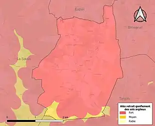 Le retrait-gonflement des sols argileux est susceptible d'engendrer des dommages importants aux bâtiments en cas d’alternance de périodes de sécheresse et de pluie. La totalité de la commune est en aléa moyen ou fort (67,4 % au niveau départemental et 48,5 % au niveau national). Sur les 147 bâtiments dénombrés sur la commune en 2019, 147 sont en aléa moyen ou fort, soit 100 %, à comparer aux 84 % au niveau départemental et 54 % au niveau national. Une cartographie de l'exposition du territoire national au retrait gonflement des sols argileux est disponible sur le site du BRGM[18],[Carte 2].