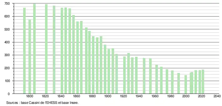 L'évolution du nombre d'habitants est connue à travers les recensements de la population effectués dans la commune depuis 1793. Pour les communes de moins de 10 000 habitants, une enquête de recensement portant sur toute la population est réalisée tous les cinq ans, les populations légales des années intermédiaires étant quant à elles estimées par interpolation ou extrapolation[24]. Pour la commune, le premier recensement exhaustif entrant dans le cadre du nouveau dispositif a été réalisé en 2007[25].